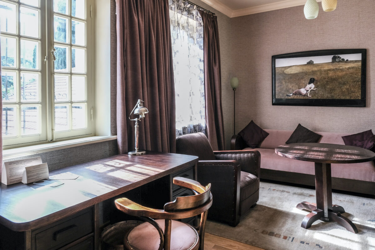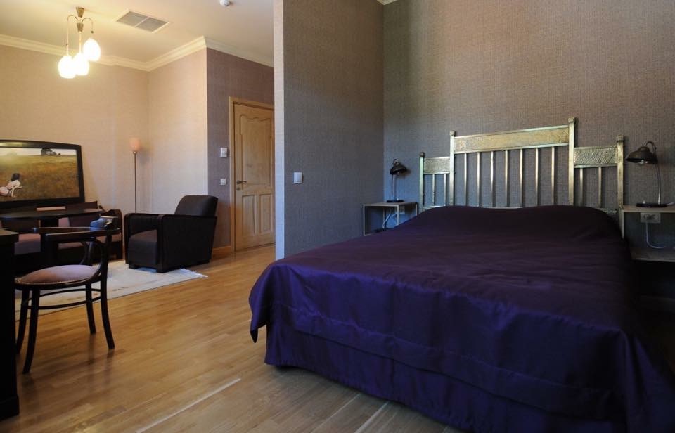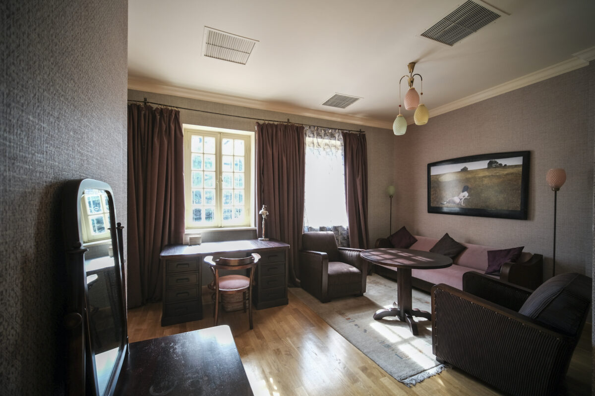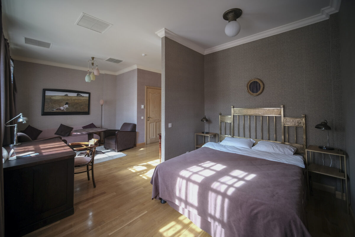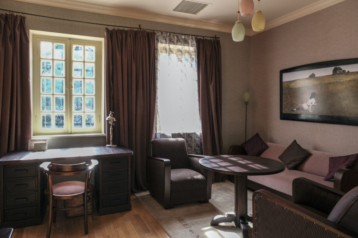 The design of the Residency was created by famous Georgian artist Guga Kotetishvili specially for Writers’ House. Refined and exclusive decoration of residential suites harmonically fuses with and continues the outstanding design of the Art Nouveau building constructed in the beginning of the 20th century. Each room is named after an acclaimed author and is unique thanks to its special and original design. Thus, Alexandre Dumas, Nizami Ganjavi, Boris Pasternak, Marjory, Oliver Wardrop, and John Steinbeck suites exist as separate “museum-rooms” at Writers’ House and add another exceptional trait to the newly launched Residency.