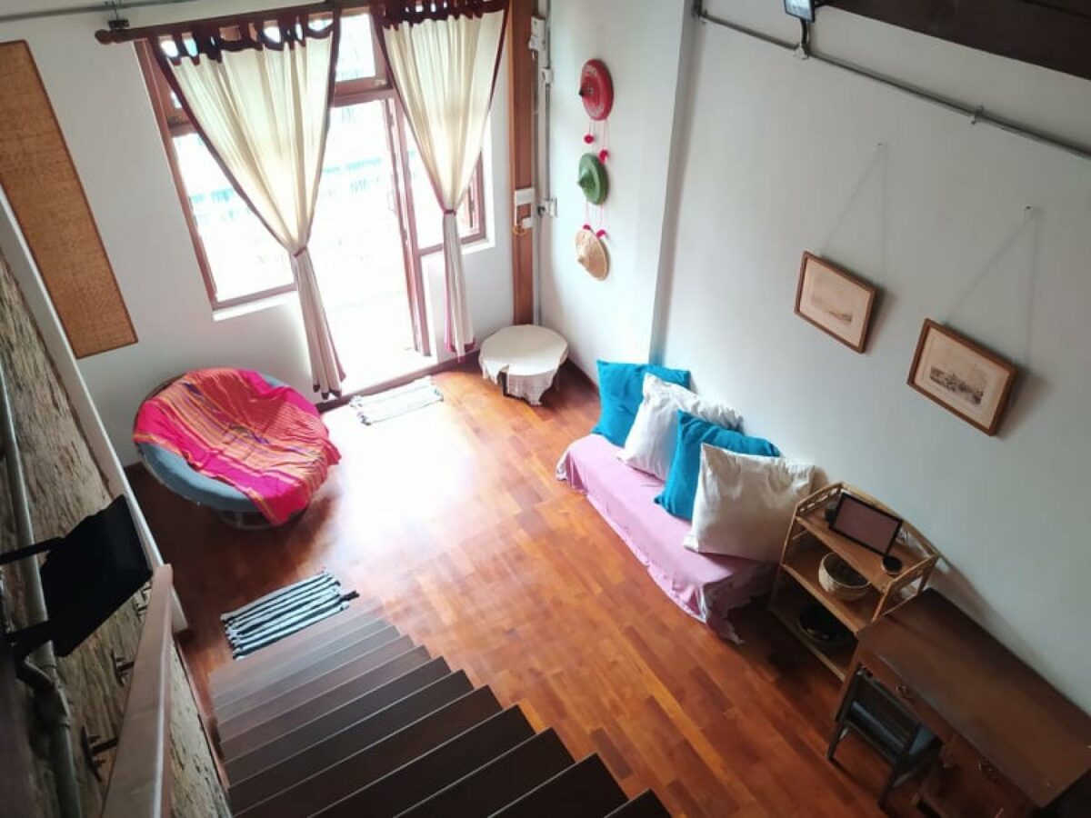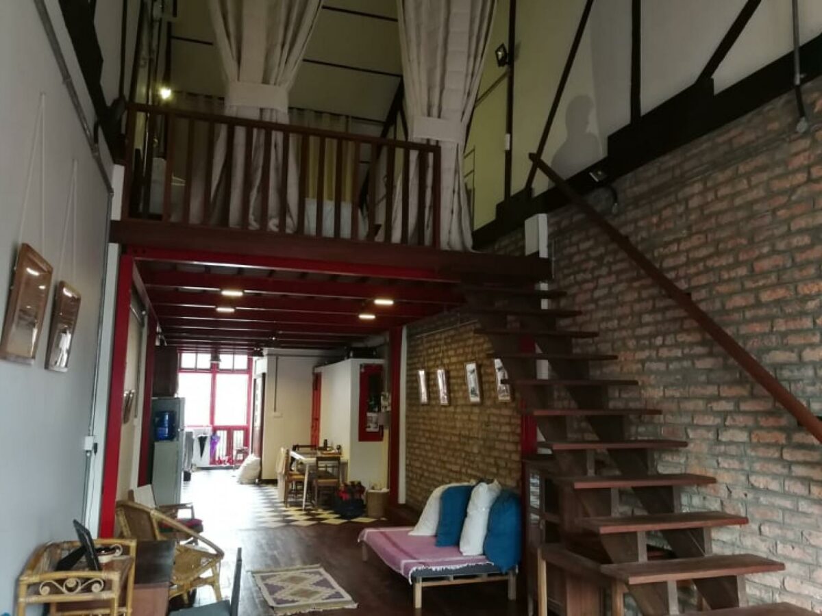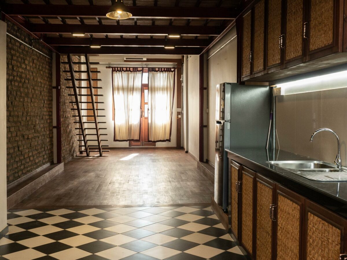 Located on Seik Kan Tha street, formerly called Lewis street, this 3rd floor loft apartment was renovated in 2019. Spanning the entire width of the building, the flat benefits from natural light from the east and west, both downstairs and upstairs, making the loft bright and airy. The lower level encompasses the kitchen, dining and living room area in one big open space which makes the apartment great for entertaining.The upstairs level is a large 45sqm mezzanine with exposed beams and an impressive dormer window to bring in plenty of light. While not renovated by Doh Eain, the flat shares a similar esthetic with exposed bricks, steel beams and use of reclaimed and natural materials.