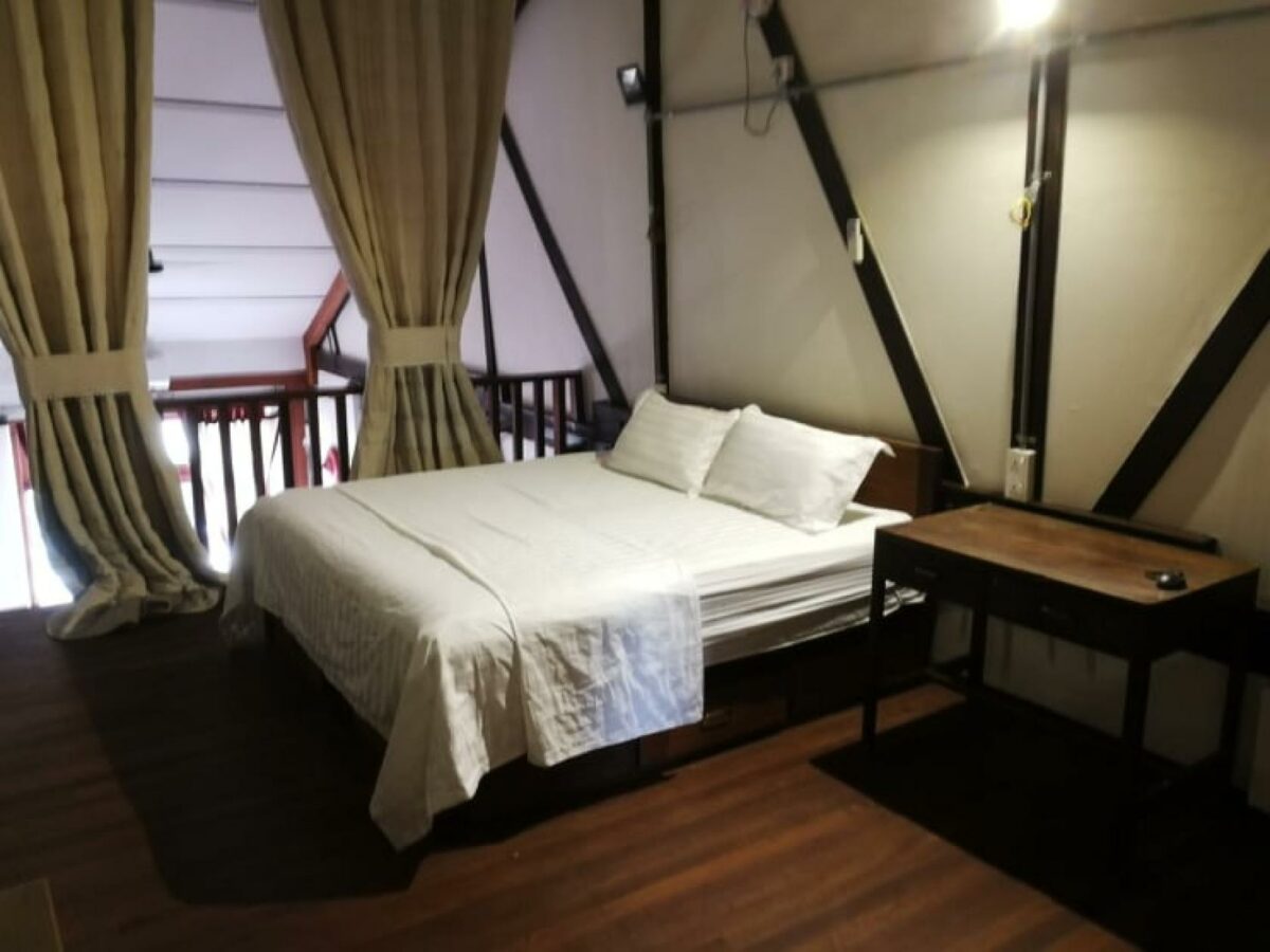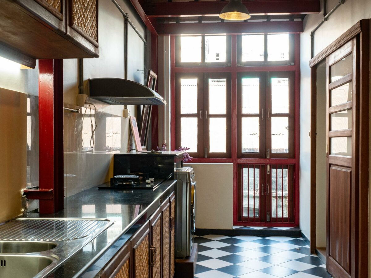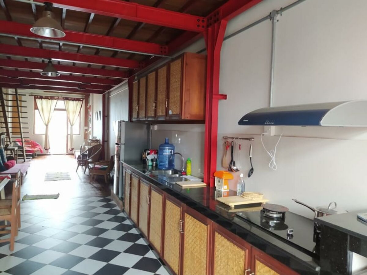 Located on Seik Kan Tha street, formerly called Lewis street, this 3rd floor loft apartment was renovated in 2019. Spanning the entire width of the building, the flat benefits from natural light from the east and west, both downstairs and upstairs, making the loft bright and airy. The lower level encompasses the kitchen, dining and living room area in one big open space which makes the apartment great for entertaining.The upstairs level is a large 45sqm mezzanine with exposed beams and an impressive dormer window to bring in plenty of light. While not renovated by Doh Eain, the flat shares a similar esthetic with exposed bricks, steel beams and use of reclaimed and natural materials.